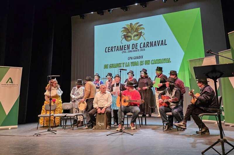 Alrededor de 225 mayores socios y usuarias de los cinco Centros de Participación Activa de la zona Norte de la provincia de Granada, así como monitores de los coros y personal de la Delegación de Inclusión Social, Juventud, Familias e Igualdad han participado en el certamen de Carnaval que la Junta ha organizado para la edición 2026 en Guadix.