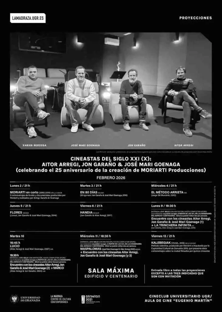 Tres de ellos, además, participarán en algunas actividades del ciclo, entre las que destaca el estreno de su último largometraje Maspalomas, que tendrá lugar el miércoles 11 de febrero a las 18.30 horas en la Sala Máxima del Espacio V Centenario. Tras la proyección, Aitor Arregi, Jon Garaño y José Mari Goneaga participarán en una charla sobre la película.
