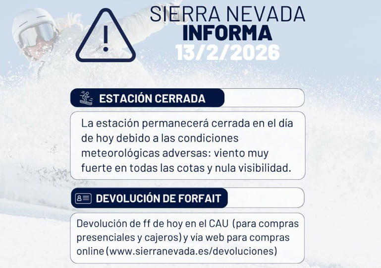 La estación de esquí de Sierra Nevada permanecerá cerrada este viernes debido a las condiciones meteorológicas adversas, concretamente por el fuerte viento que azota en todas las cotas y la nula visibilidad.