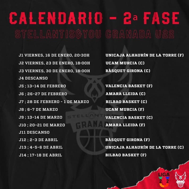 El Stellantis & You Granada ya conoce su hoja de ruta para la segunda fase de la liga U22. El equipo dirigido por Samu Gómez, que estará encuadrado en el grupo B, comenzará la competición contra el Unicaja Alhaurín de la Torre el próximo viernes, 16 de enero, en el pabellón Blas Infante de la localidad malagueña.