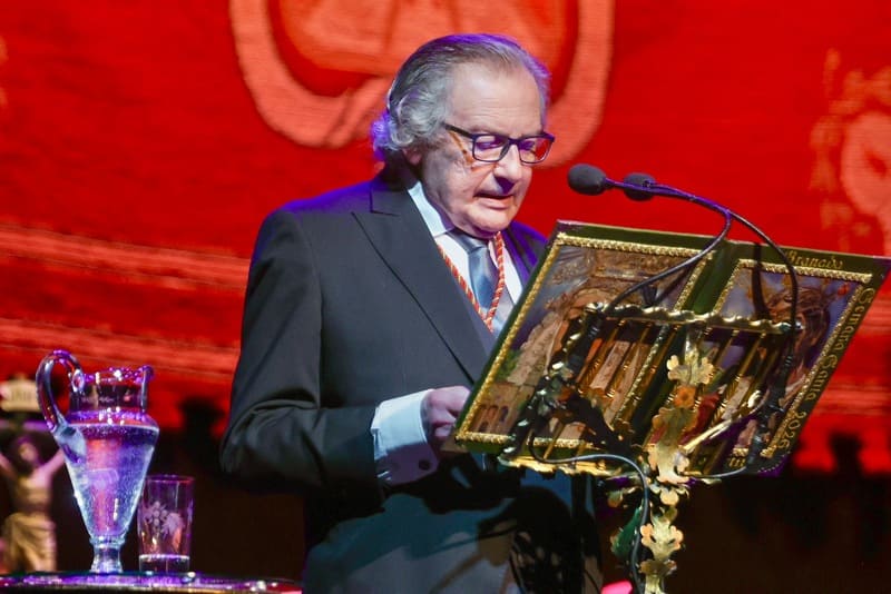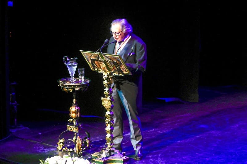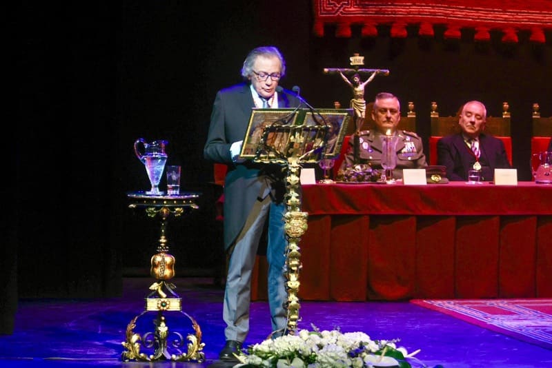 El pregonero construyó su intervención como quien desgrana un rosario íntimo de recuerdos. No hubo verso ni métrica que encorsetara su mensaje; eligió la libertad de la prosa para recorrer su biografía cofrade, desde la infancia como hermano de la Aurora hasta la madurez comprometida con sus hermandades, reivindicando- no sin sorna- que “habiendo solicitado en repetidas ocasiones el carnet de cofrade, no se me ha concedido”. Su voz, pausada y firme, fue tejiendo una crónica sentimental que trascendió lo personal para convertirse en patrimonio colectivo.