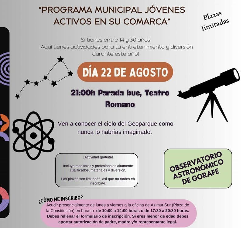 La salida está prevista a las 21:00 horas desde la parada de autobuses del Teatro Romano. Según ha explicado la concejala de Juventud, «esta actividad se repite cada verano debido a la gran aceptación y demanda por parte del público joven», y ha destacado que la jornada comenzará con una charla introductoria sobre nociones básicas de astronomía.