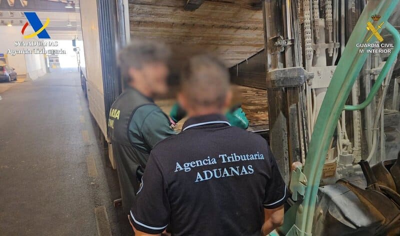 Durante la inspección, agentes del Servicio de Vigilancia Aduanera y de la Unidad de Análisis e Investigación de Fiscal y Fronteras de la Guardia Civil del Puerto de Motril contaron con el apoyo de unos perros del servicio cinológico, que marcaron los bajos del camión. Posteriormente, al revisar el interior del semirremolque, los agentes detectaron un doble fondo.