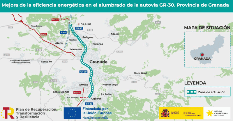 El Ministerio de Transportes y Movilidad Sostenible va a iniciar las obras de mejora de eficiencia del alumbrado en la autovía GR-30, Circunvalación de Granada, con un presupuesto vigente de casi 3 millones de euros con cargo a los fondos europeos del Plan de Recuperación.