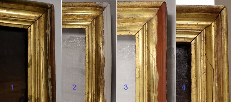 En el caso del marco, tras la limpieza y la eliminación de los repintes, se reintegraron volumétricamente todos los estucos faltantes para, a continuación, reintegrarlos cromáticamente con una base entonada en el color del bol rojo y acuarela dorada aplicada mediante rigatino.