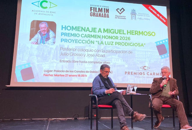 Uno de los momentos más destacados fue el homenaje al director granadino Miguel Hermoso, distinguido con el Premio Carmen de Honor de esta quinta edición. El reconocimiento se materializó con la proyección de La luz prodigiosa y un coloquio posterior con José Abad y Julio Grosso, en una sesión dedicada a su trayectoria y aportación al cine andaluz.