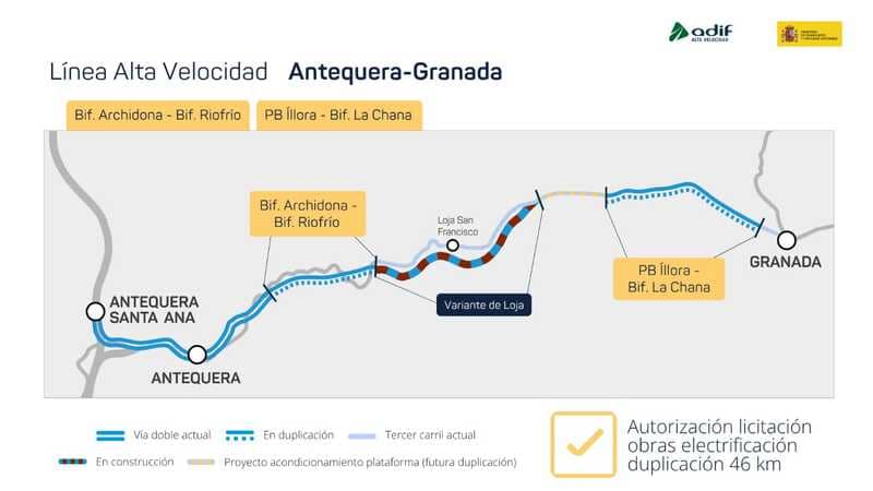 El Ministerio trabaja actualmente en varias actuaciones para completar la capacidad y operatividad de esta conexión. Entre ellas, la duplicación de los tramos Bifurcación Archidona-Bifurcación Riofrío y Puesto de banalización de Íllora-Bifurcación La Chana, que suman 46 kilómetros y cuya electrificación ha sido ahora autorizada.