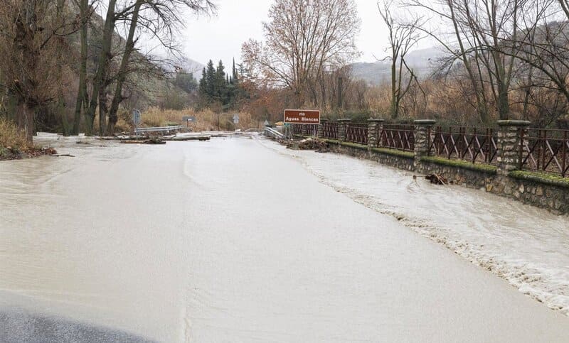 (IMAGEN: carretera cortada al inundarse por el desbordamiento del río Aguas Blancas tras el paso de la borrasca Leonardo la semana pasada- Álex Cámara – Europa Press)