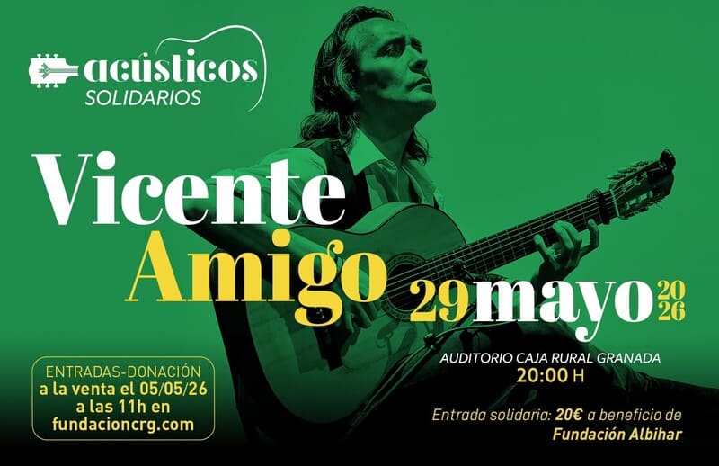 Vicente Amigo se incorpora al cartel de los Acústicos Solidarios de Fundación Caja Rural Granada con un concierto muy especial que tendrá lugar el próximo 29 de mayo en el Auditorio de la Entidad. El reconocido guitarrista presentará su gira Andenes del tiempo, álbum nominado a los Latin Grammy 2024, en una velada que aunará excelencia musical y compromiso social. Las entradas estarán disponibles a partir del 5 de mayo a las 11:00 horas, en la web de la Fundación.