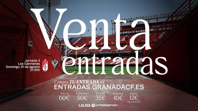 Las entradas para el partido entre el Granada Club de Fútbol y el Club Deportivo Mirandés correspondiente a la jornada 3 de LaLiga Hypermotion, que se disputará este domingo 31 de agosto, a las 21.30 horas, se pondrán a la venta desde este lunes 25 de agosto, a las 13.00 horas, tanto de forma presencial, en las taquillas del estadio, como de manera online.